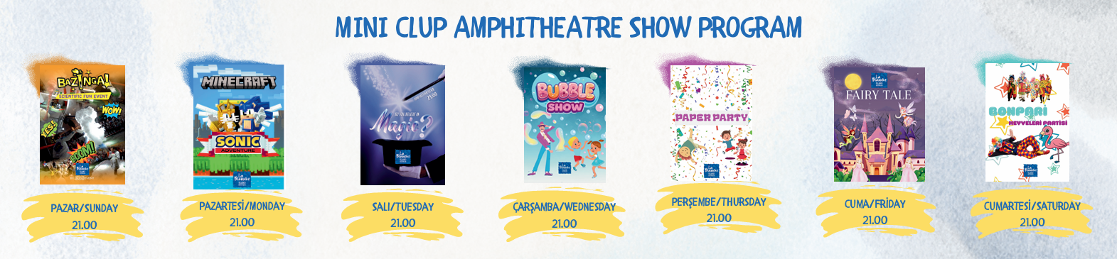 Minik misafirlerimiz için özel olarak hazırlanan yaz eğlence programımızda; eğitici atölyeler, yaratıcı oyunlar, havuz aktiviteleri, mini disko ve sürpriz gösteriler ile çocukların hem eğleneceği hem de yeni arkadaşlıklar kuracağı keyifli bir tatil deneyimi sunuyoruz.